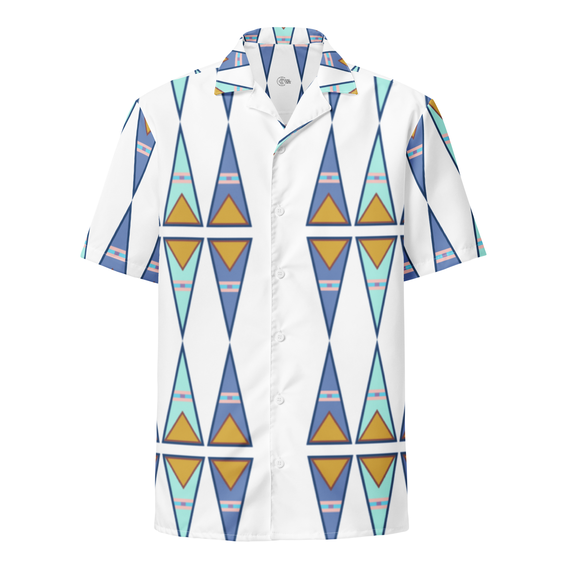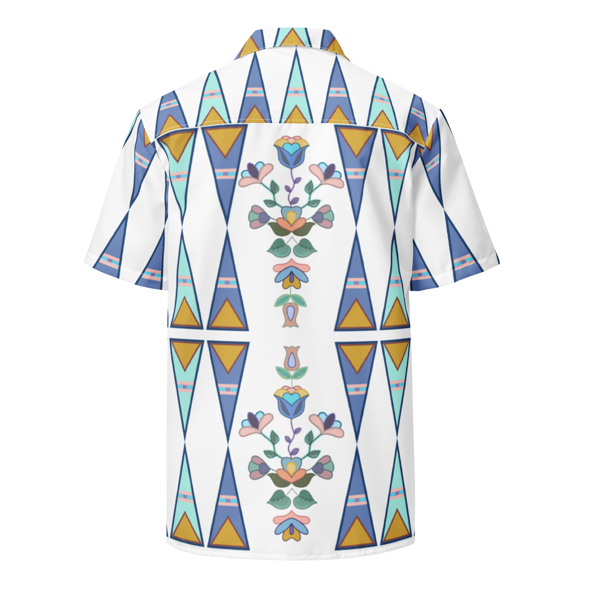 This short-sleeve button-up blends clean geometric design with soft, comfortable fabric made for everyday wear. The bold pattern features traditional-inspired shapes in calming blues, golds, and turquoise, with a floral motif down the back for a subtle touch of balance and story.