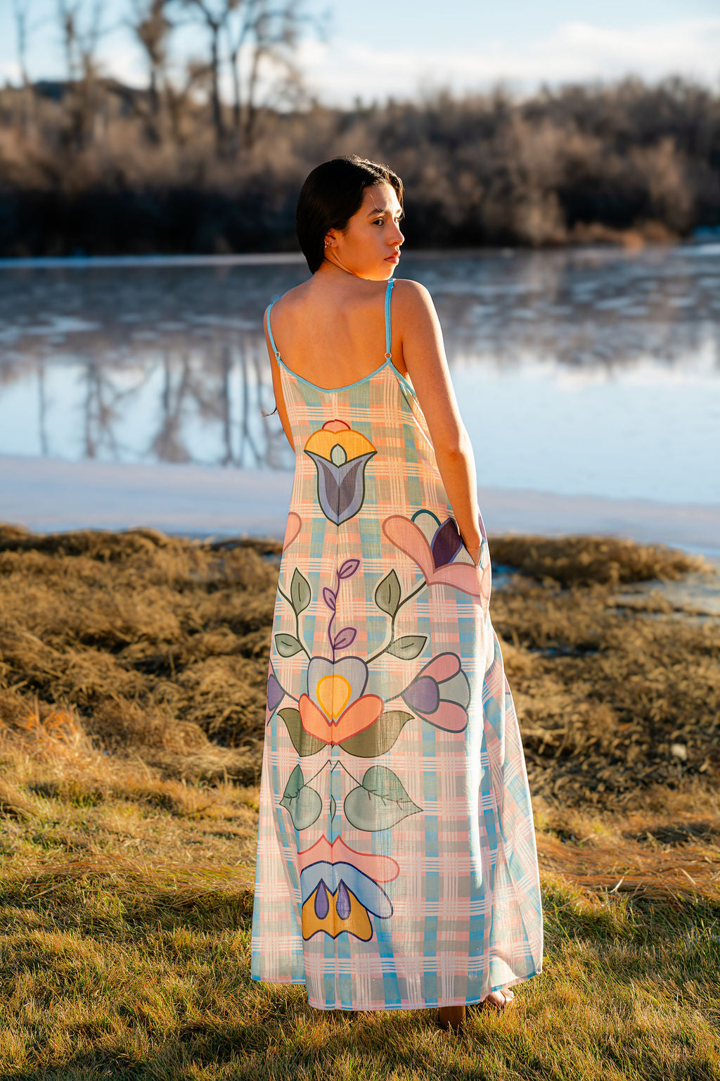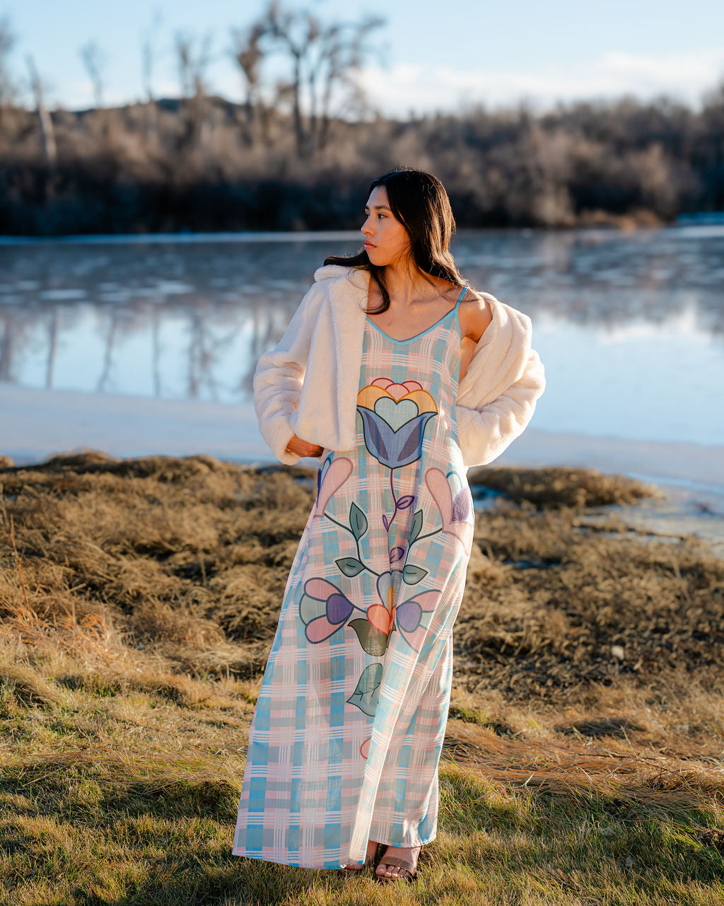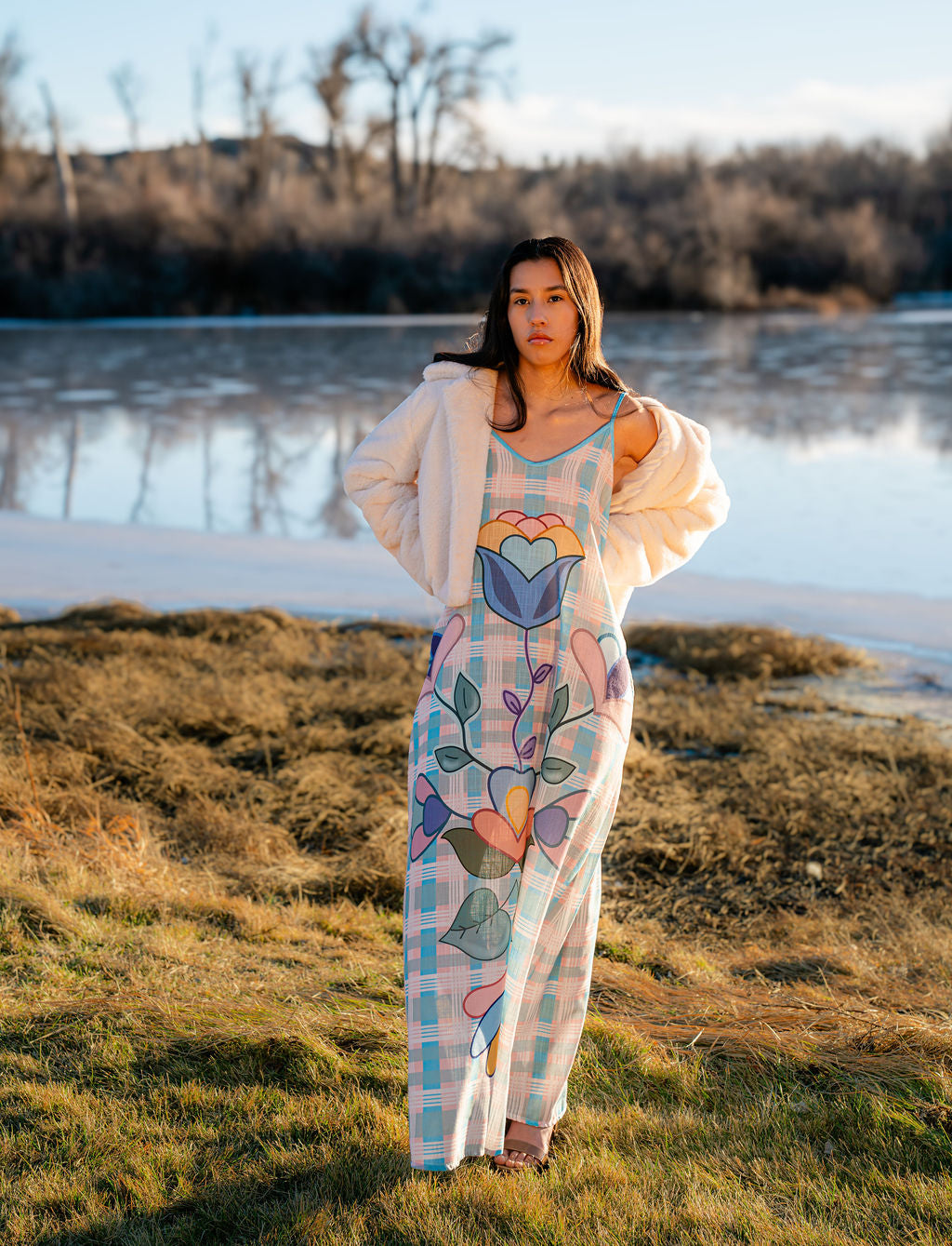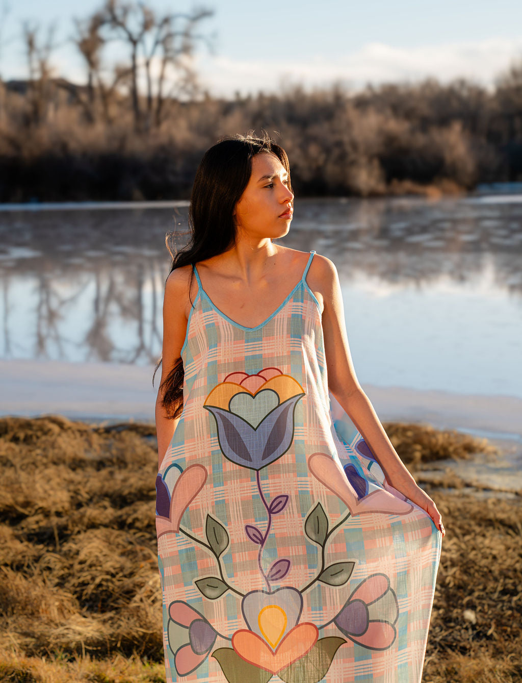 The floral pattern is inspired by my original Apsáalooke floral beadwork design, transforming traditional beadwork into wearable art. A timeless, comfortable dress that blends cultural expression with everyday ease.