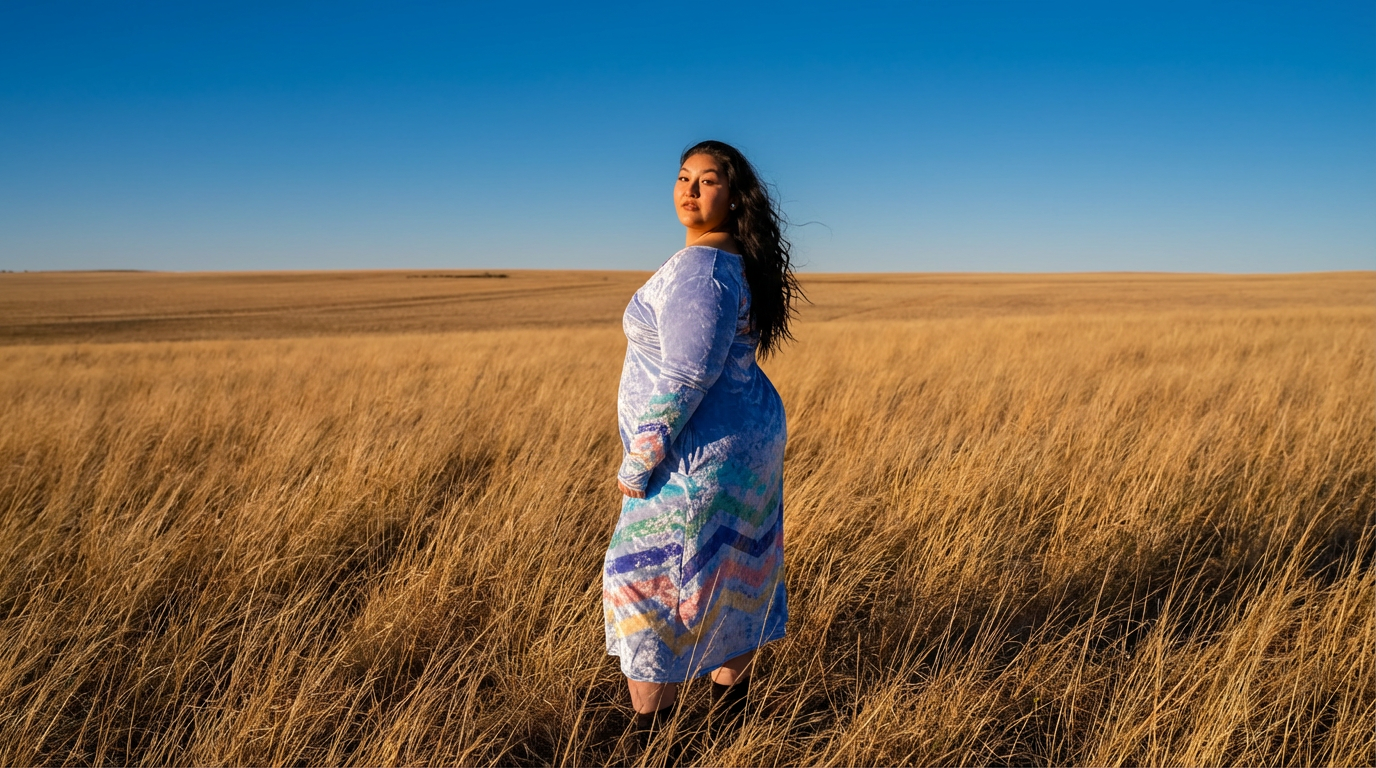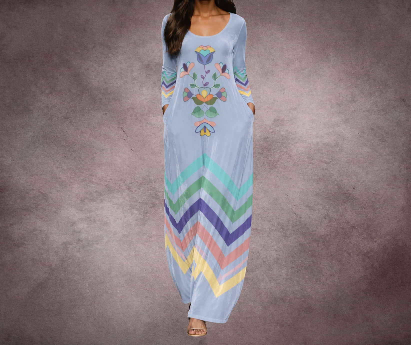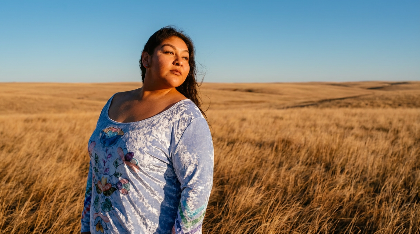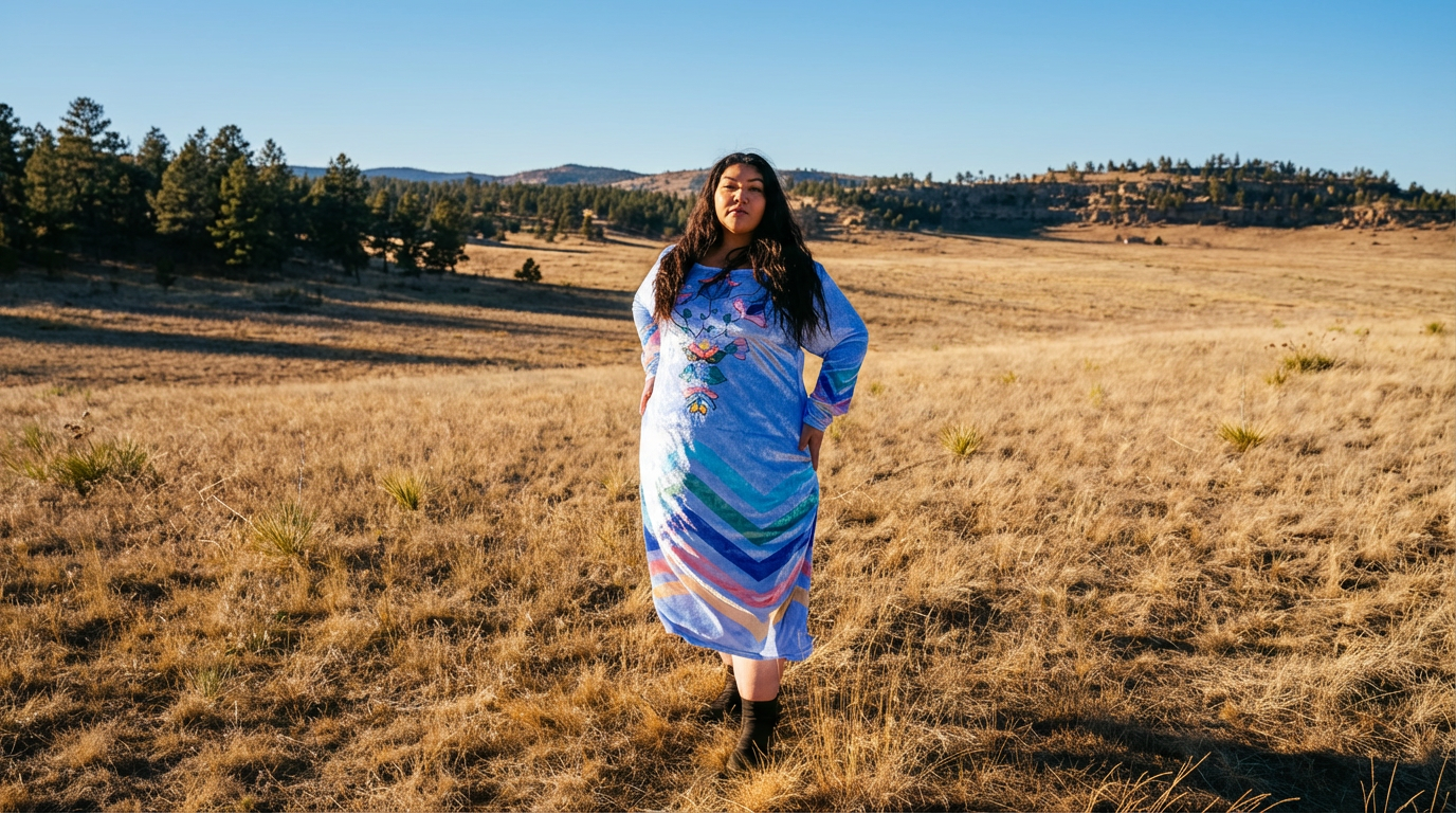 Lustrous and elegant, this light blue crushed velvet maxi dress features a shimmering finish with a soft, stretchy feel. Designed with an Apsáalooke floral and ribbon rickrack pattern, it flows beautifully with every step. Complete with hidden side pockets and available in sizes Small–5XL, this dress blends comfort, culture, and effortless style.
